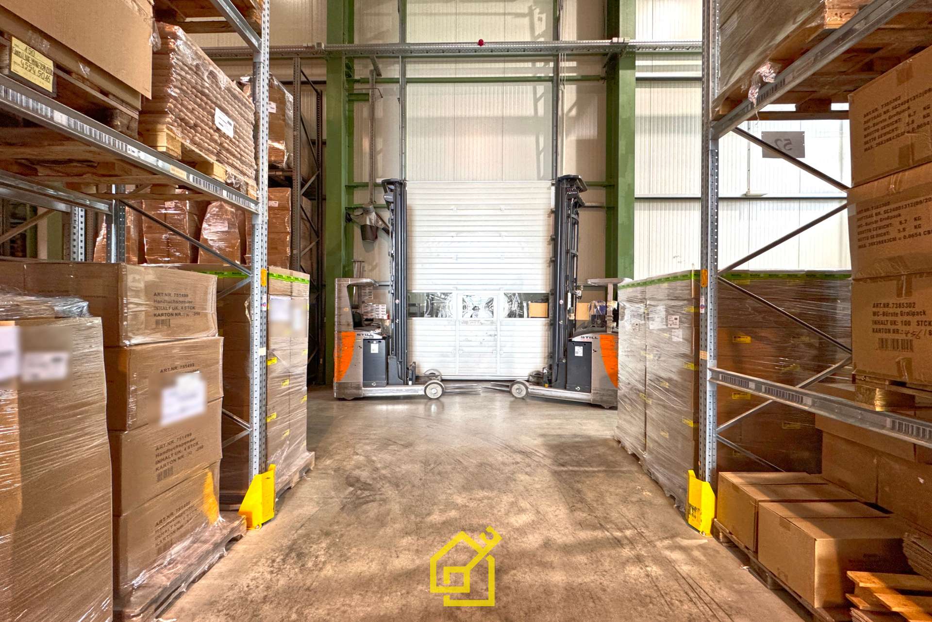 Das Hochregallager bietet Raum für ca. 5000 Paletten, wobei die Andienung mittels Schmalgangstaplern erfolgt. Die Wareneingang und Versand-Halle dient als Umschlagimmobilie mit 4 hydraulischen Verladerampen und überdachter Warenanlieferung sowie einem integrierten Werkstattbüro und Aktionsflächen. Ergänzt wird das Ensemble durch einen eingeschossigen Anbau für Sozialräume und Haustechnik (Brandschutz, Heizung, Ladestation).